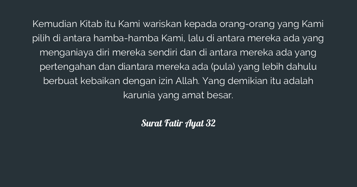 Orang yang melaksanakan kewajiban agama dan meninggalkan larangan agama, tetapi jarang mengerjakan amalan sunah Orang yang selalu cepat berbuat kebaikan, orang yang kebaikannya banyak, dan sedikit kesalahannya. Orang yang menganiyaya diri mereka sendiri, yaitu orang yang kesalahannya lebih banyak daripada kebaikannya. Orang yang zalim kepada dirinya b. Dan apabila hal ini telah ditetapkan, maka sesungguhnya ayat ini mengandung makna yang umum mencakup ketiga golongan dari umat ini. Ayat 32 dalam surah ini mengandung tiga pelajaran yang menarik bagi seorang muslim. Namun, dalam realita kehidupan di antara umat islam ada berbagai macam sikap. Menurut surat fatir ayat 32, yang dimaksud dengan muqtasid adalah …. 32) bahwa adapun orang yang lebih cepat berbuat … Kandungan yang terdapat dalam surah fatir ayat 32. Orang yang mengerjakan amalan yang wajib dan yang sunah c. (faathir':32) maka ia mengatakan bahwa yang dimaksud adalah orang yang mencampuri amal salehnya dengan amal buruk. Dengan meremehkan dalam mengamalkannya atau lebih banyak kesalahannya daripada kebaikannya atau melakukan maksiat namun di bawah kufur.